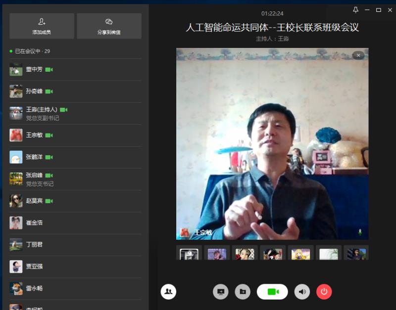 2月22日上午9:00,人工智能191班召开视频特别班会,王宗敏董事长、张启峰书记、王淼副书记、辅导员孙奇峰及人工191全体同学参加。
