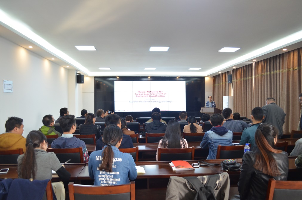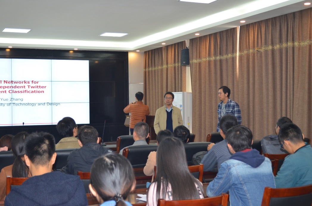 为促进与提高永利集团304am官方入口在大数据与数据科学学科方向研究,2016年10月25日,公司邀请新加坡技术与设计大学助理教授、博士生导师张岳老师到永利集团304am官方入口科技园区舆情中心会议室做了《Neural Networks for Target-dependent Twitter Sentiment Classification》的学术报告。永利集团304am官方入口、图书馆与新传学院等相关学科的负责人和教职工参加了此次学术报告。
