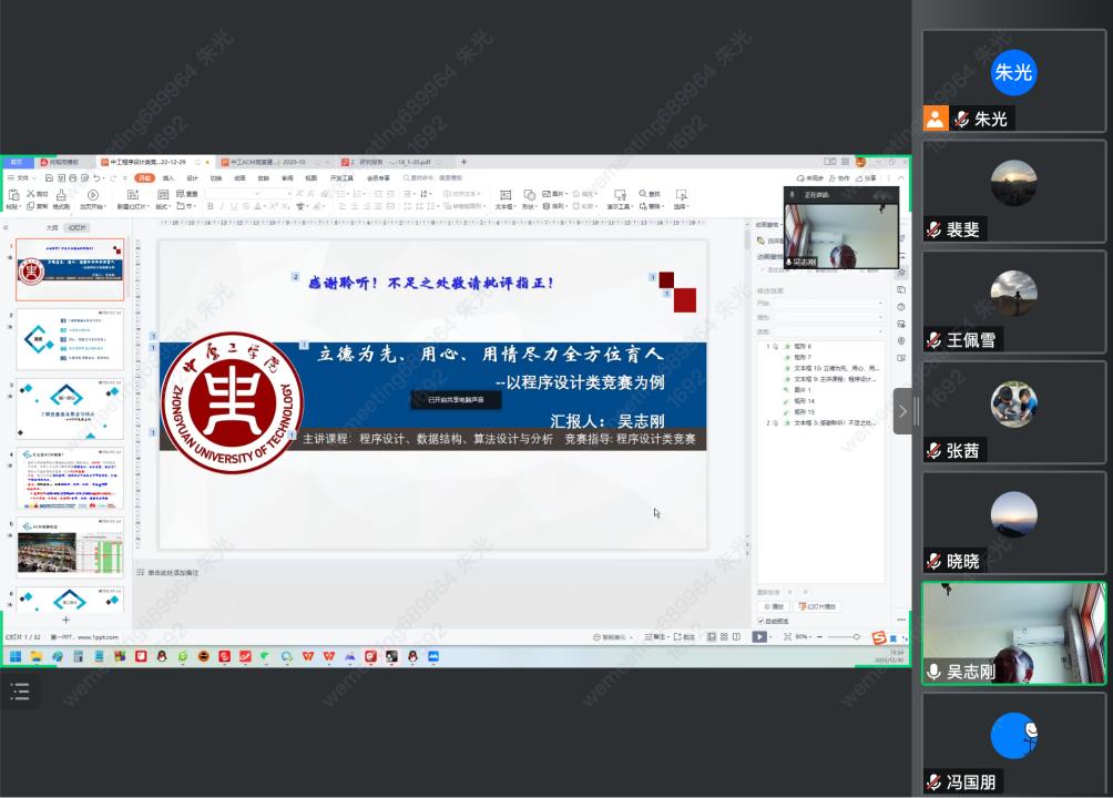 会上,王佩雪副经理通报了2022年度学院学科竞赛参赛和获奖情况,充分肯定了本年度学科竞赛取得的成绩,指出存在的不足,提出了改进措施。随后,吴志刚老师从ACM介绍、为何立德为先、用心用情尽力全方位育人、团队建设以及以赛促教等方面,作了题为《立德为先、用心、用情尽力全方位育人》的经验分享。冯国朋老师从团队介绍、竞赛历程、组织活动,员工培养,以及当前存在问题和未来展望等方面分享了网络安全竞赛经验。董跃钧老师从竞赛介绍、竞赛组织、日常管理、获得成绩等方面分享了华为ICT大赛的参赛经验。与会教师进行了热烈讨论和经验分享,提出了很多建设性的意见和方法。