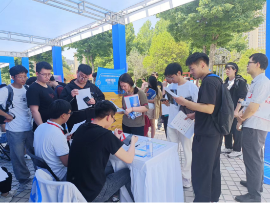 公司毕业生们在双选会现场的多家展位前,和信息技术、软件行业优质企业的HR、招聘人员们进行交流,了解企业招聘需求和现场招聘情况,纷纷向心仪企业投出简历。
